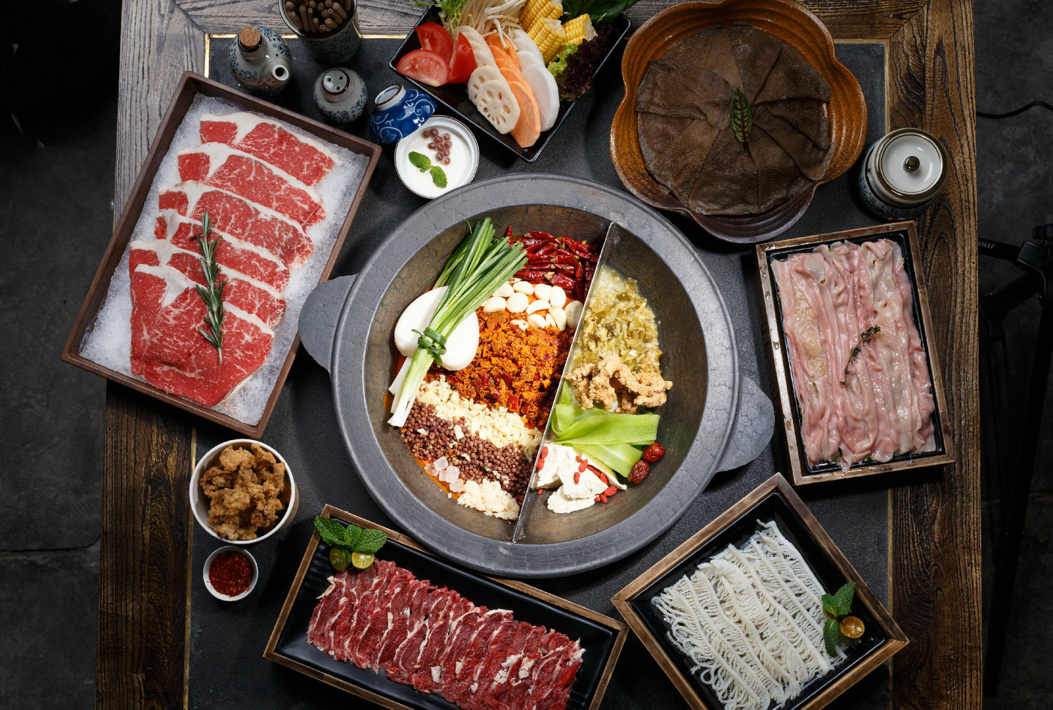 吼堂首创三七分锅底酸菜酥肉豆花锅+经典麻辣牛油铜底辣而不燥