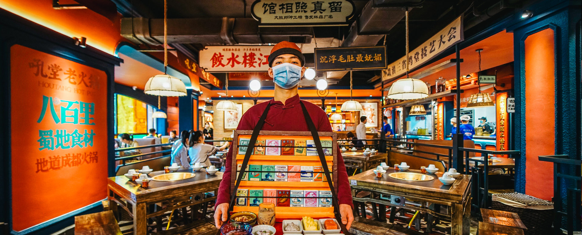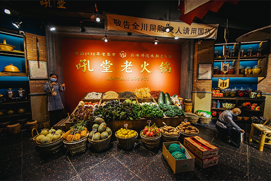 装修风格,搭配道明竹编、桂花龙窑,绵竹年画等巴蜀非遗手工艺术品,将菜市场搬到火锅店里,还原老成都的茶馆文化和民国时期的火车站,回到街头巷尾和热闹喧嚣的集市风貌。